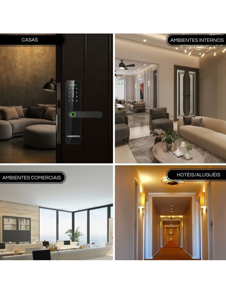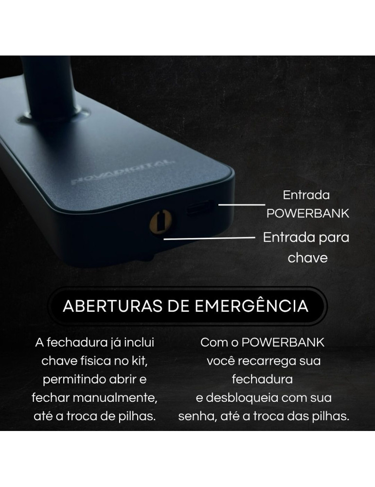 Tipos de desbloqueio: Biométrico, cartǎo de acesso, chave manual e senha.